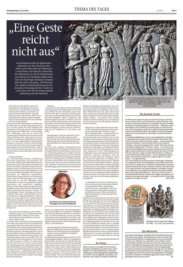 “Deutschland hat über ein Jahrhundert gebraucht, um dem Genozid an den Herero und Nama selbst als Völkermord zu bezeichnen. Jetzt liegt der Entwurf für ein Abkommen vor, das die Schuld betont und Geld an die Nachfahren fließen lässt. Doch der Ethnologin Katharina Schramm geht das nicht weit genug. “Wir brauchen eine stärkere Auseinandersetzung mit der deutschen Kolonialgeschichte”, fordert sie – und damit auch mit den Folgen globaler Ausbeutung und des Rassismus.